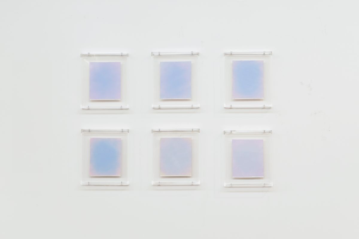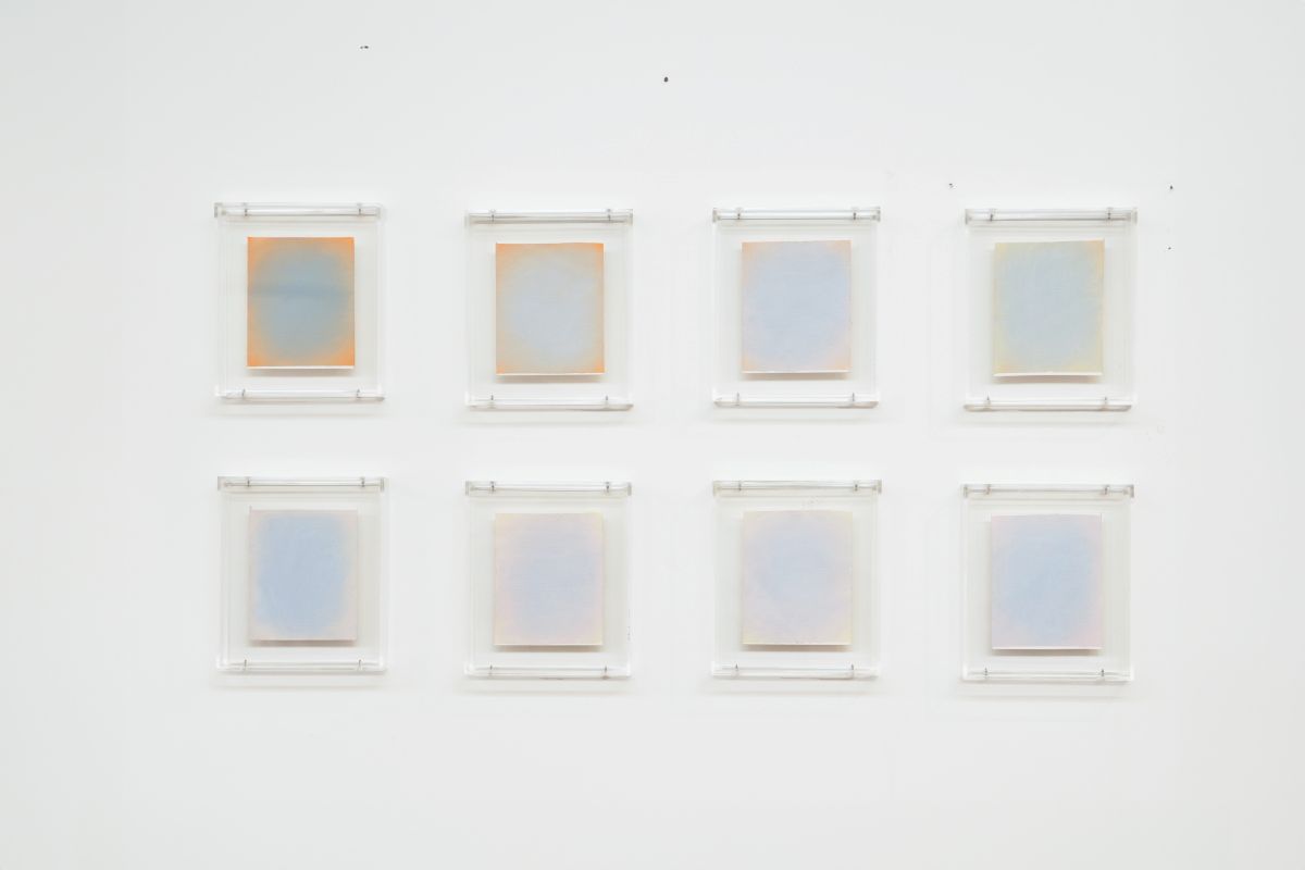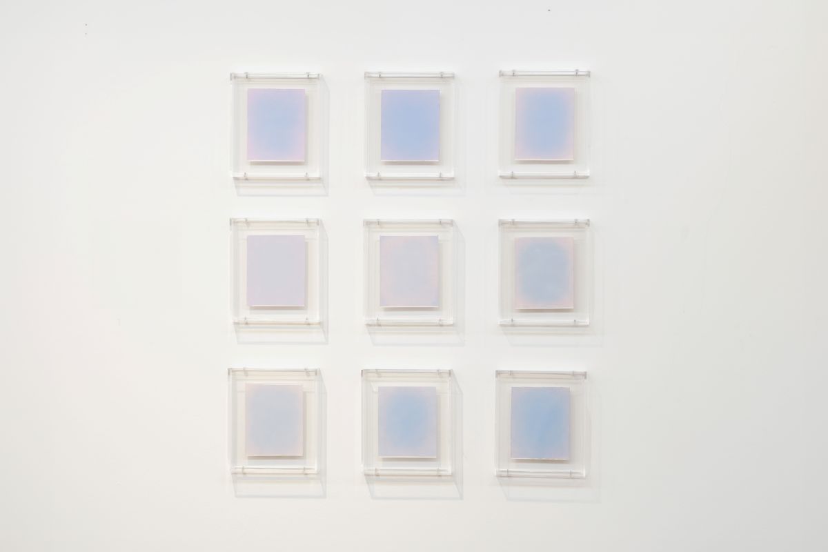 A série Estudos para um pôr do sol reúne experimentos cromáticos realizados pela artista em pequenos fragmentos de papel, utilizados como um meio de visualização e compreensão do resultado final antes da transposição para telas maiores de linho.