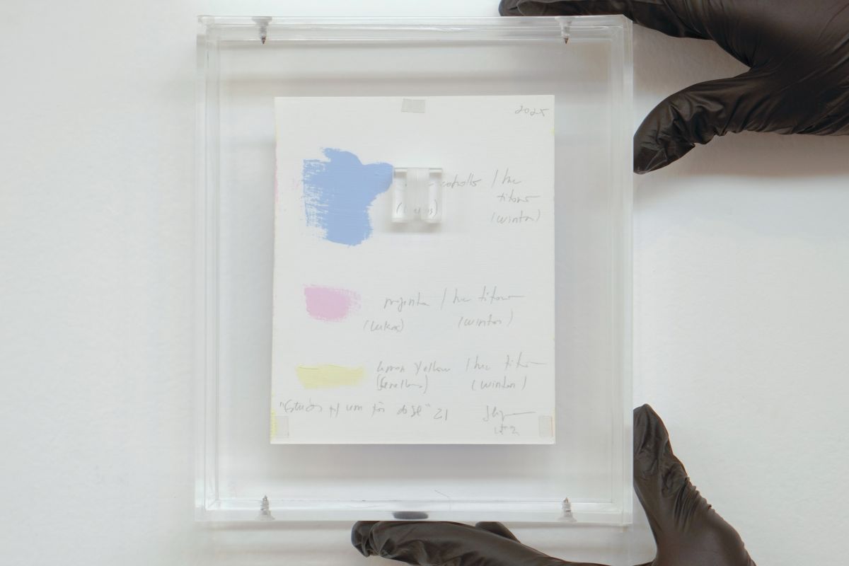 Segundo a artista, a preparação das tintas destinadas às telas de grande formato pode levar mais de um dia, dependendo da quantidade necessária. As pinceladas de cores variadas registradas no verso de cada papel correspondem às tintas efetivamente preparadas e utilizadas nesses testes.