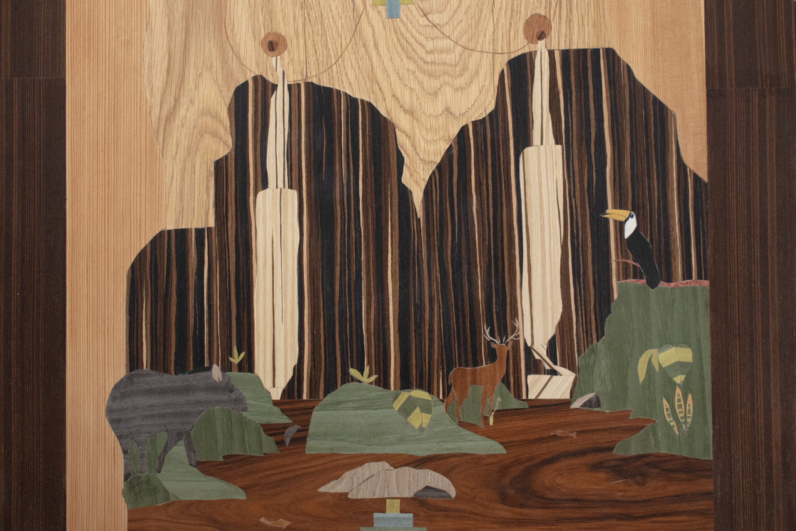 His visual production is based on marquetry, a technique he learned at the School of Arts of the Dirson Costa Institute, which he attended between 2005 and 2007. The method derives from juxtaposing and fitting cutted fragments of wood to form landscapes, motifs and symbols. Bu’ú’s compositions feature graphics, colors and representations drawn from his culture, revealing to us the potential of art in shaping knowledge about the world and society. In addition to his visual production, the artist also directs and writes theater plays, such as Sapo Taro Bekê (2006), Tui-Sá Kumurõ (2009), and Ensinamento do Beija Flor (2010). In 2011, he served as coordinator of the Casa das Culturas Indígenas, a cultural project held in Cotia, Brazil.