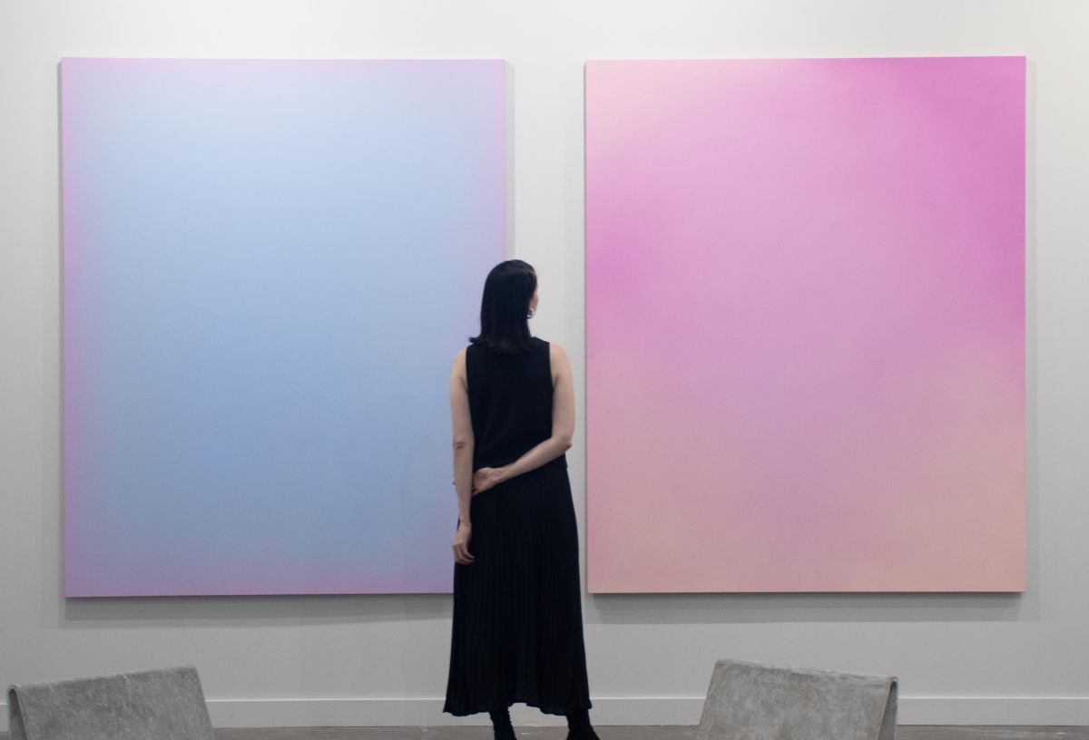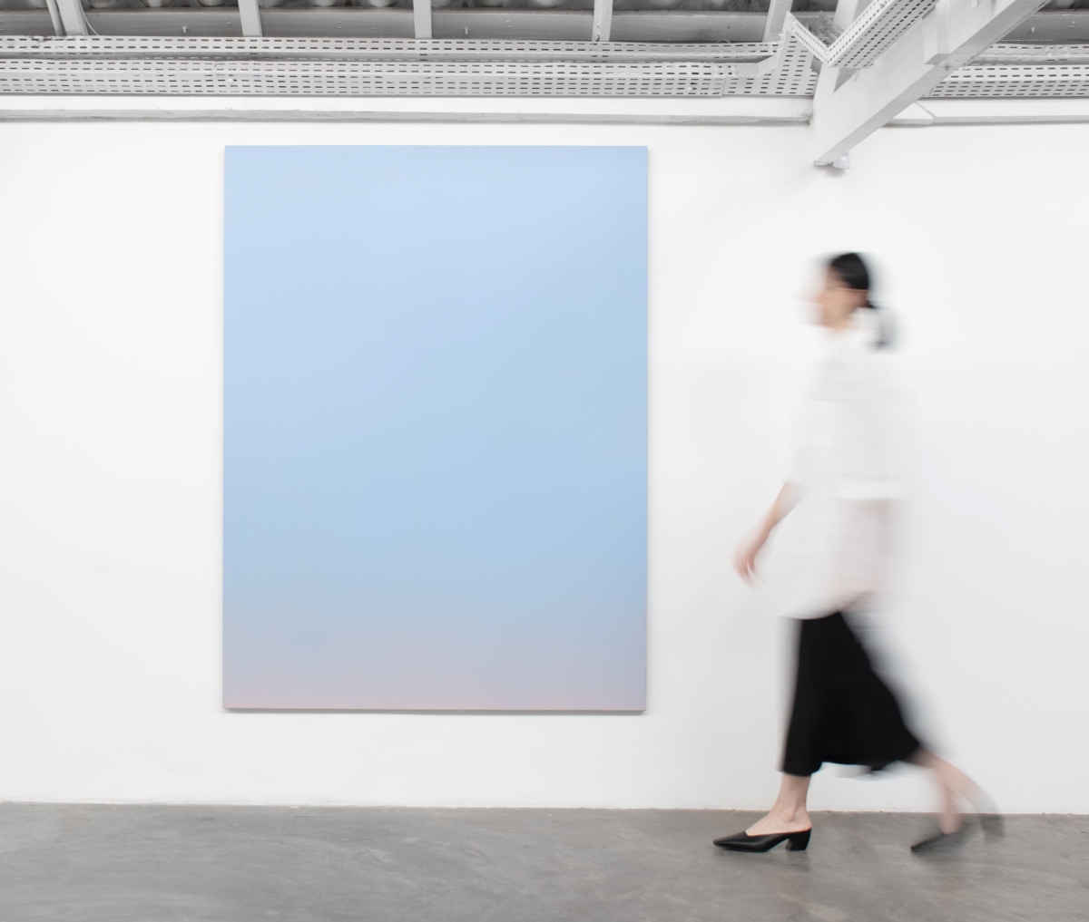 The atmosphere of silence evoked in her paintings is a result of the leading role of physical experience in the reception of the work. Silence, in that case, is not of the order of absence. In the chromatic harmony of Sakamoto’s paintings, there is something like a musical chord, since three tones intertwine to create a single note that continually reverberates within us. In this sense, we can perceive a discreet musicality in her works, investing in the synesthetic potential of her chromatic arrangements to establish a sensorial experience that exceeds the gaze. Sakamoto’s innovative approach to abstract painting, finally, converges the color field research with the erasure of the expressive hand present in minimalism.