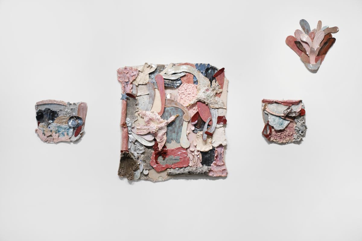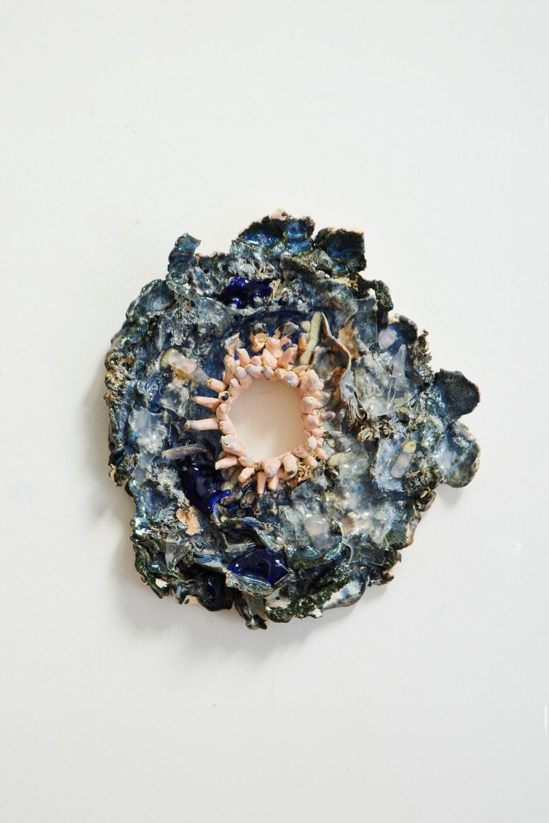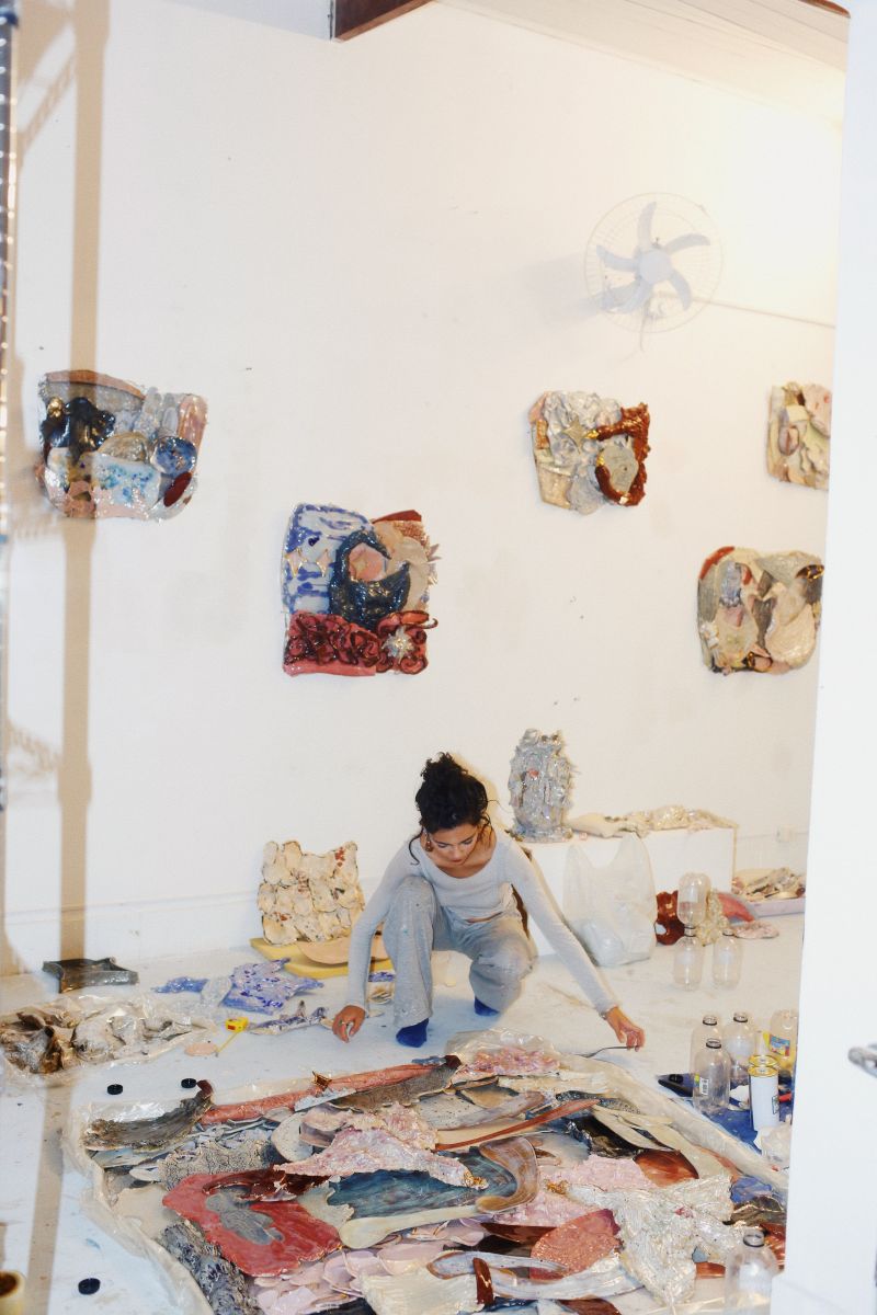 A partir da colagem de fragmentos, cria esculturas que transitam entre natural e sintético, figurativo e abstrato, sagrado e profano. Enquanto evocam o cosmos, suas obras falam também do íntimo, do corpo e do enfeite, convidando o olhar a se perder entre excesso e detalhe.
