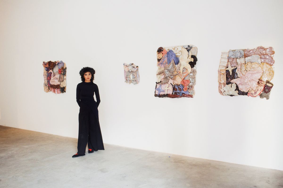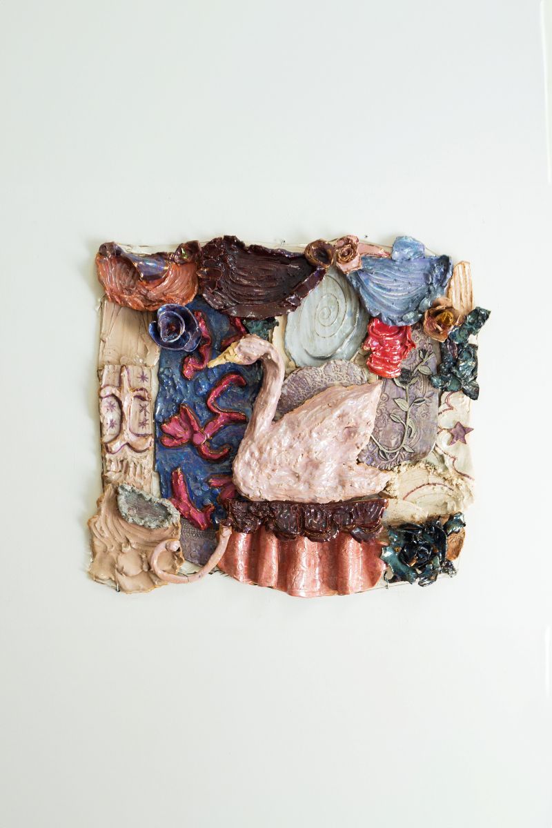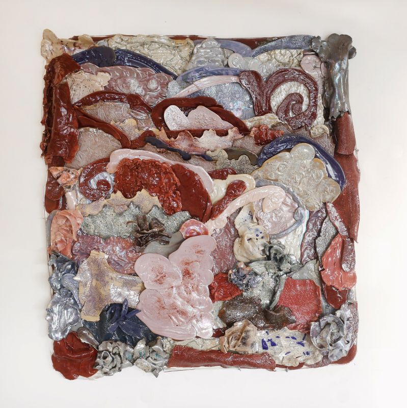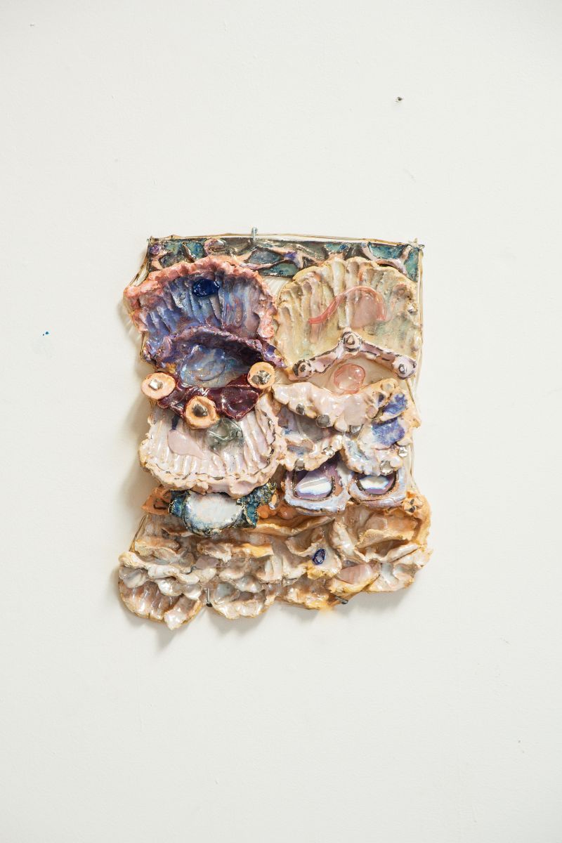 A partir da colagem de fragmentos, cria esculturas que transitam entre natural e sintético, figurativo e abstrato, sagrado e profano. Enquanto evocam o cosmos, suas obras falam também do íntimo, do corpo e do enfeite, convidando o olhar a se perder entre excesso e detalhe.
