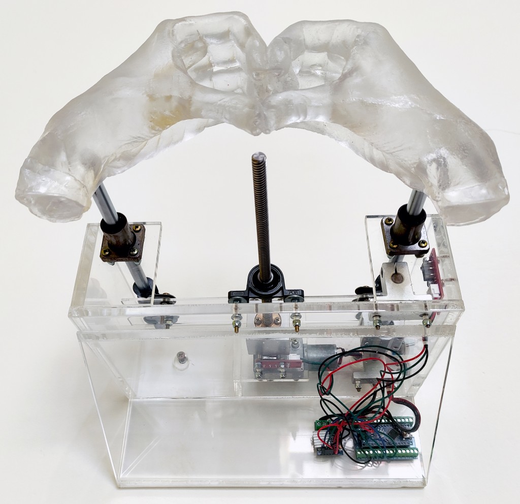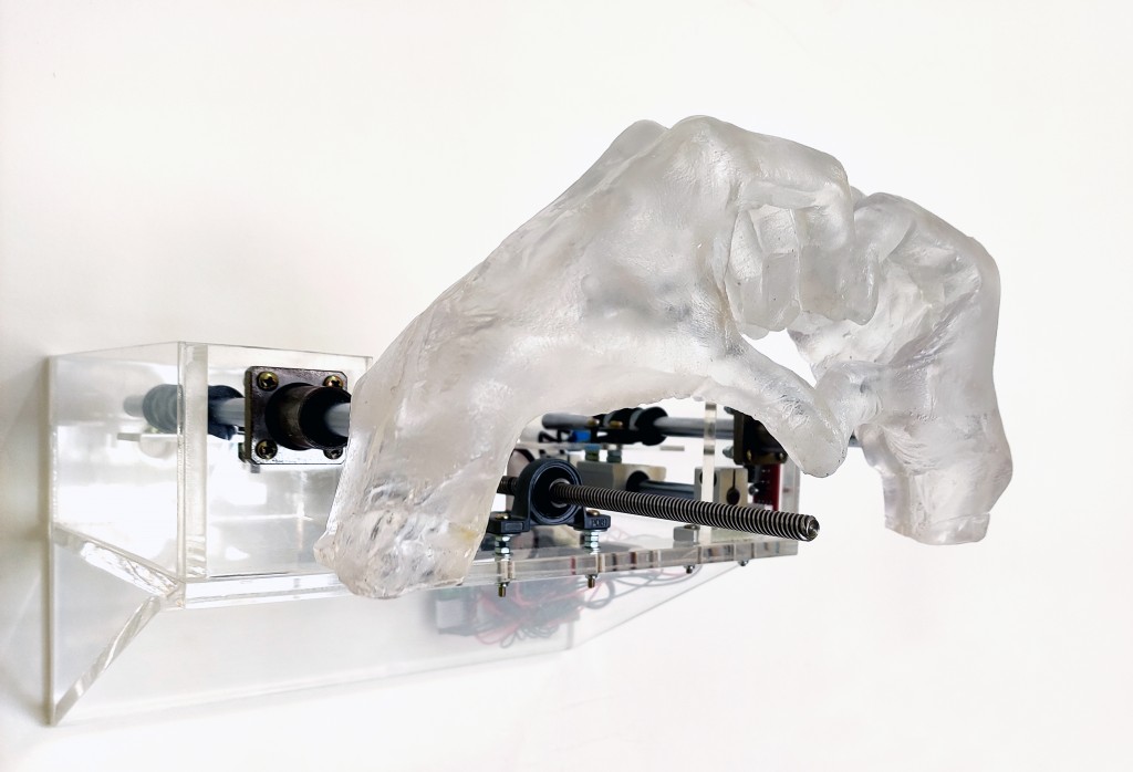 Leandra Espírito Santo (1983, Volta Redonda, Brasil) é uma artista cujo trabalho visual atravessa múltiplas linguagens, explorando a intersecção entre gesto e forma. Sua pesquisa se caracteriza pela transformação de gestos em esculturas, máquinas que realizam ações e vídeos que, através da técnica de stop-motion, retornam às suas origens fotográficas. A centralidade do processo é fundamental em sua prática, abordando a dinâmica, o deslocamento e o movimento tanto do corpo quanto da imagem.