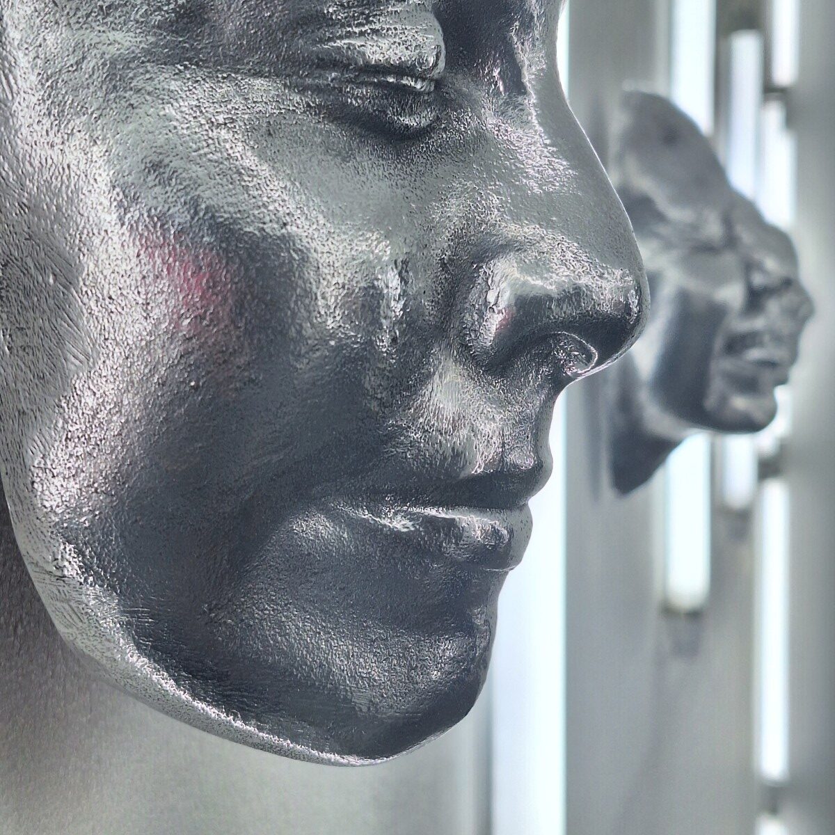 A artista investiga os efeitos dos processos industriais na formação da cultura, utilizando materiais que refletem essa perspectiva e incorporando a repetição e a modularidade em seus arranjos formais. Leandra foca no impacto das novas tecnologias no sujeito, utilizando seu próprio corpo e de outros indivíduos como modelos. Em suas obras, como nas expressões das máscaras e nos gestos das mãos, ela explora a relação entre corpo e tecnologia, apresentando uma crítica à experiência fragmentada da corporeidade nos ambientes virtuais.